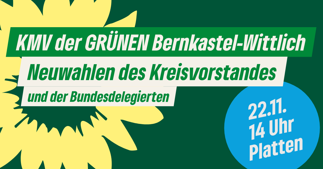 Der Kreisvorstand von BÜNDNIS 90/Die Grünen Bernkastel-Wittlich lädt zur Mitgliederversammlung am Samstag, den 22.11.2025 um 14:00 Uhr im Winzerhofcafé Görgen, Bahnhofstr. 14, 55418 Platten ein. Im Rahmen der Versammlung stehen die Neuwahl des Kreisvorstandes sowie der Bundesdelegierten an. Interessierte Bürgerinnen und Bürger sind herzlich eingeladen. Es wird aus organisatorischen Gründen um Anmeldung bis 22.11.2025 per Mail an: kv-bernkastel-wittlich@ gebeten. gruene-rlp.de
